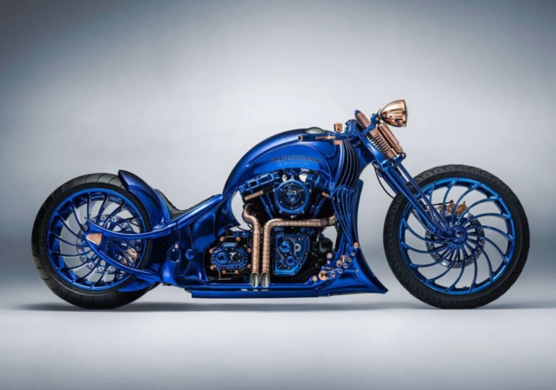 Etonnant, délirant, extraordinaire, bluffant, dingue, etc. Les qualificatifs pour illustrer cette moto totalement unique ne manquent pas ! En effet, Bucherer vient de présenter sa dernière collaboration. Résultat ? Une moto Harley Davidson Blue Edition (modèle unique) qui a demandé 2.500 h de travail et qui embarque une montre en or et une bague avec solitaire. Probablement la moto la plus chère au monde avec ses près de 1,6 million d’euros !